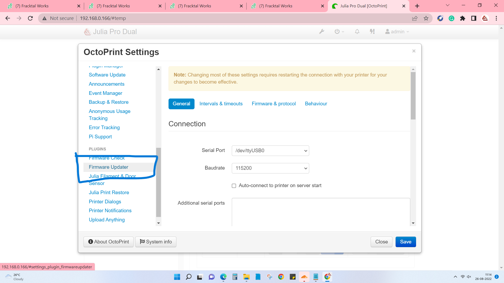 Note: After putting putting new drivers with updated jumper configurations, you need to start the machine to connect to OctoPrint. After turning on the machine, do not move any of the components, like xyz axis or the extruder. First, you need to flash the firmware before operating the printer.