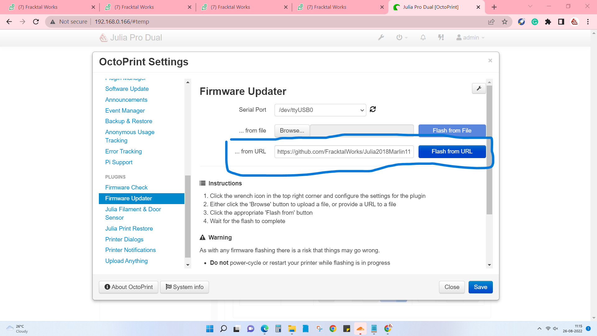 Click on Settings> firmware update plugin> Update from URL>