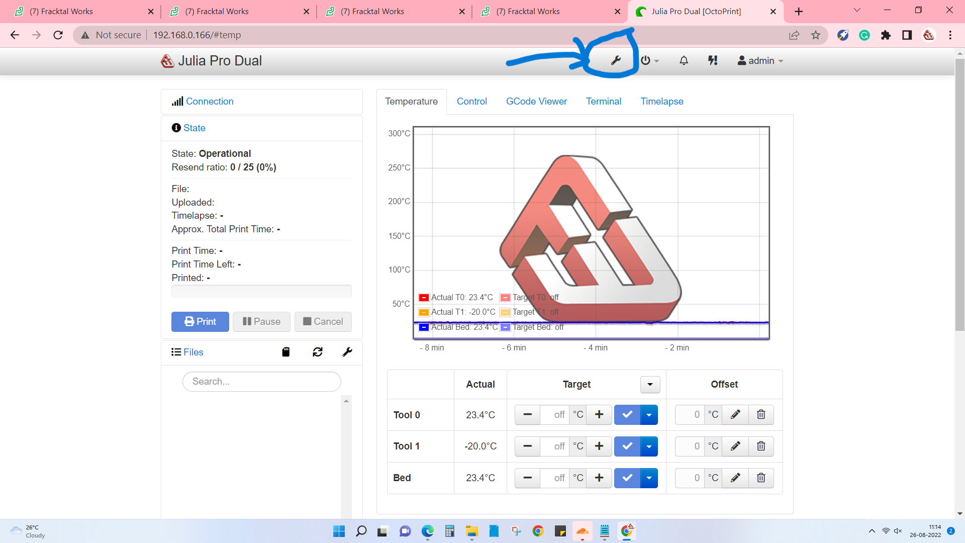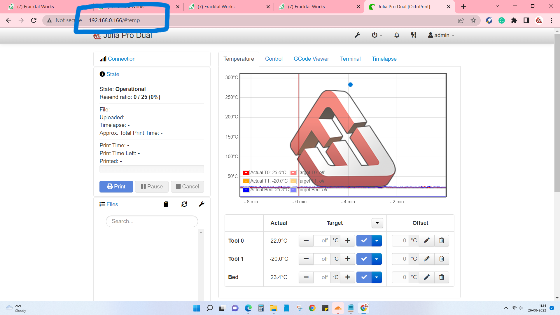 1. Turn on the printer and access it using Octa Print using the printer’s IP address.